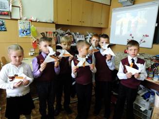В память о величии человеческого подвига, о людях, сумевших защитить свою Отчизну, мы зажгли свечу памяти. Ребята изготовили солдатские письма-треугольники, украсили их голубем Мира и георгиевской ленточкой.